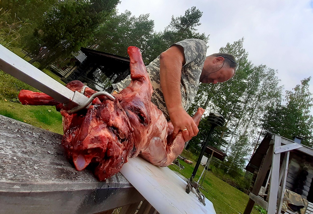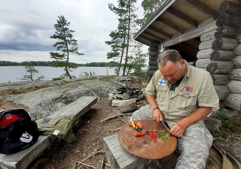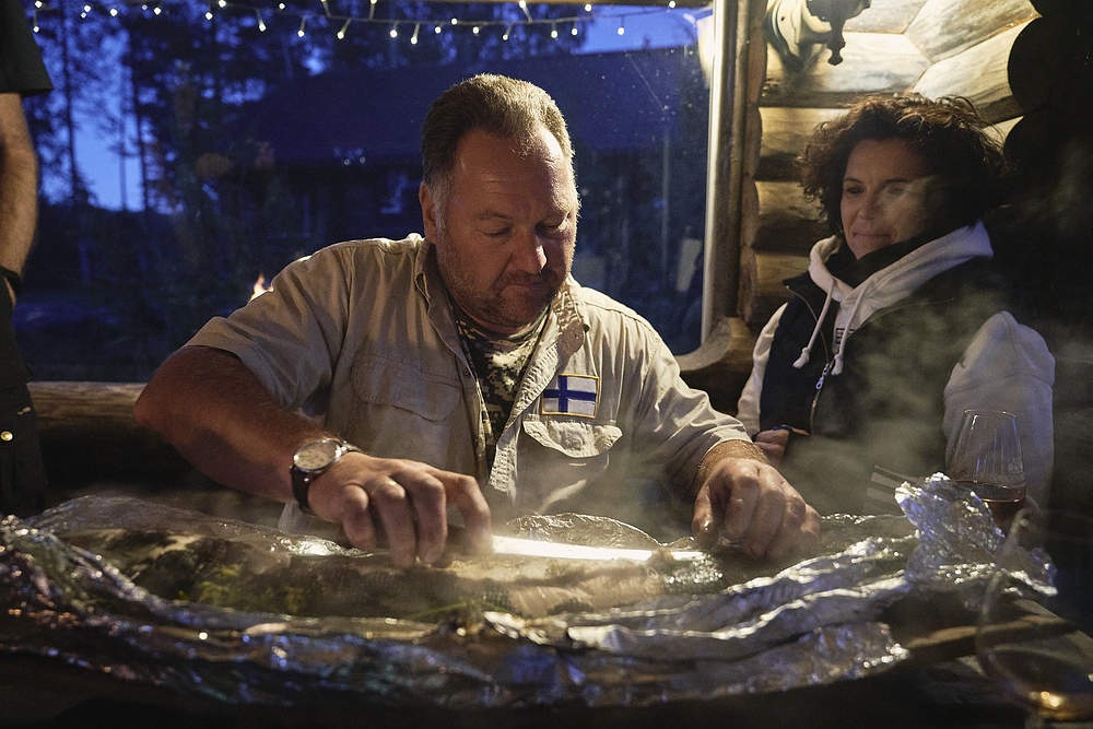 | Fischereilich muss man zu Finnland, was Barsch und Hecht angeht, ja nicht viel sagen. Da waren meine Erwartungen generell hoch. Jedes der traditionellen Blockhäuser hat ein weiteres Haus für eine Sauna wie auch einen finnischen Grillplatz mit Blick über das nicht enden wollende Wasser mit seiner typisch finnischen Baumlandschaft. Da fanden wir uns zum Dinner ein. Von Hecht über Elch Entrecote, angefangen bei den Muikkos (kleine Maräne), wurden wir beim live Cooking über Feuer von Roland, immer in Begleitung eines ausgezeichnet korrespondierenden Weines bekocht. Völlig fertig in Erwartung auf den kommenden Tag, ging es dann in die komfortablen Häuser. Der kommende Morgen hätte nicht spannender sein können. |