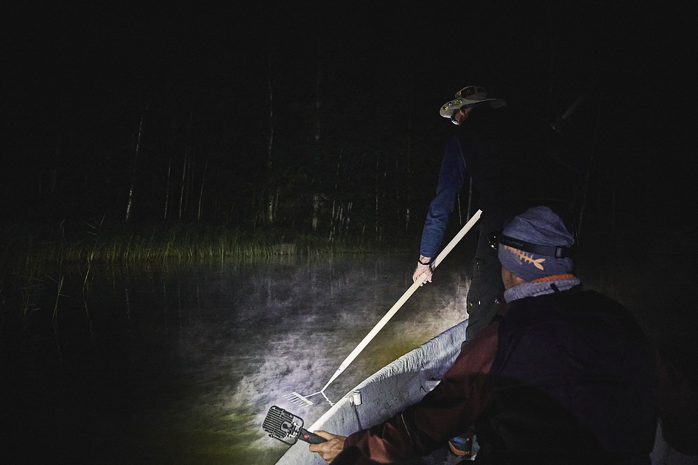 | Nach viel Abwechslung und im Glauben alles erlebt zu haben was dieser Ort zu bieten hat wurde es noch von einer Sache getoppt. Eingetroffen im Camp bereiteten wir uns mit zunehmender Dämmerung auf Pasi Lethosari vor. Er ist der finnische Gastgeber und Eigner dieser überragenden Landschaft. Als er eintraf wussten wir nicht so ganz was da auf uns zukam. Er hatte einen fünf Meter langen Stock in der Hand. Am Ende befand sich eine kleine Metall Forke. Es hies traditionelles Fischstechen wie vor hunderten von Jahren. Ein absolutes Privileg, dies als nicht Einheimischer ausführen zu dürfen. Mann gegen Fisch. Es hört sich so verletzend und ungerecht an. Ein Speer gegen einen Fisch. Ich wollte es aber dennoch erleben und zumindest dabei sein. Also Taschenlampe raus, warm angezogen und quer durch den Wald, zu einem der entlegenen Moorseen. Dort wartete ein Ruderboot auf uns. Pasi hatte eine starke Lampe dabei und los ging es. Es war magisch. Der Neben stieg im Wasser auf, es war totenstille. Man konnte die umgekippten dunklen Bäume im Wasser nur erahnen. Der Scheinwerferkegel reichte eben bis zum glasklaren Grund in einem Meter Tiefe. Ruhig und behutsam ruderte uns der Finne durch die Nacht. |