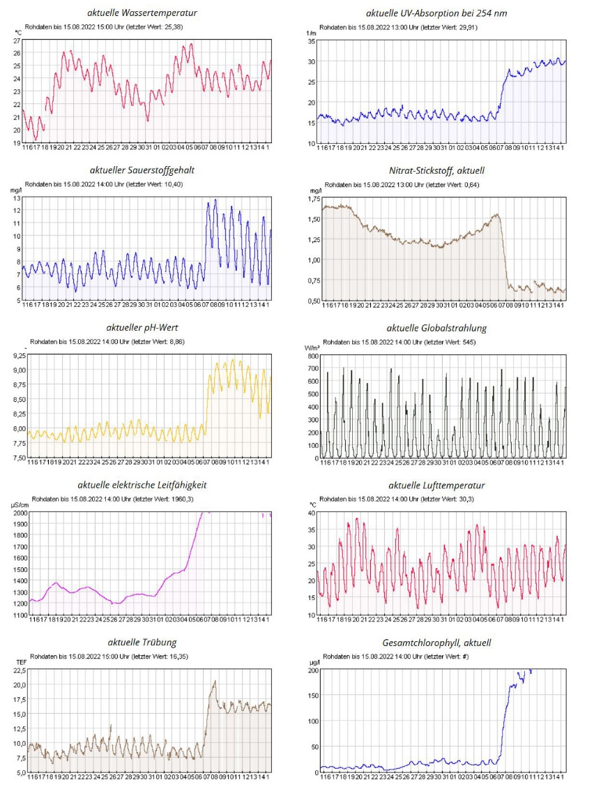 Pressemitteilung DAFV Fischsterben an der Oder und die Suche nach der Ursache Berlin, 16.08.2022. Seit letzter Woche erreichen uns viele Bilder und Informationen über ein massives Fischsterben in der Oder. Für viele Bürger unseres Landes wird zum ersten Mal auf sehr tragische Weise deutlich, dass es ein pulsierendes Leben unter der Wasseroberfläche gibt. Seit vergangenen Dienstag haben Angler tote Fische im deutschen Bereich der Oder gefunden, die Behörden informiert und angefangen, die Fischkadaver zu beseitigen. Ein großer Dank an alle Helfer! Laut Schätzungen sind in den vergangenen Tagen bis zu 100 Tonnen Fisch in der Oder verendet. Aus Messdaten des Landesamtes für Umwelt Brandenburg (LfU) ist auch für Laien deutlich zu erkennen, dass sich die meisten der gemessenen Wasserwerte um den 07. August stark verändert haben (siehe Abbildung). In Verbindung mit einem Pegelanstieg um 30 cm sprechen die Messwerte dafür, dass ein Wasserkörper mit abweichenden Eigenschaften in die Oder gelangt und stromabwärts geflossen ist. In den betroffenen Abschnitten der Oder wurden