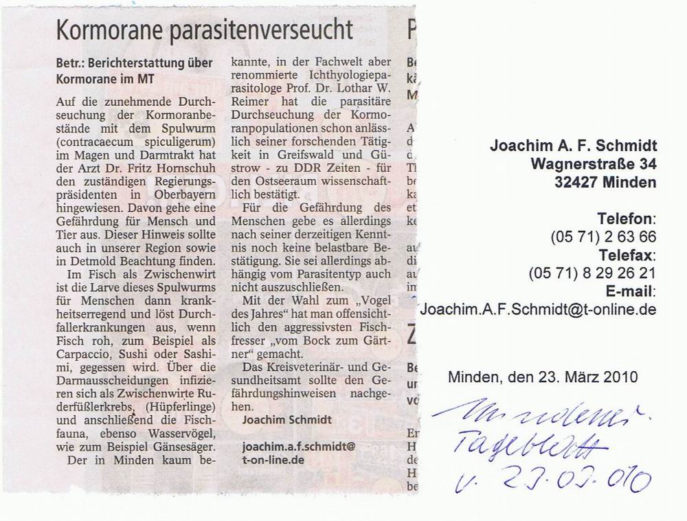 Kormorane parasitenverseucht. Betr. Berichterstattung über Kormorane im MT