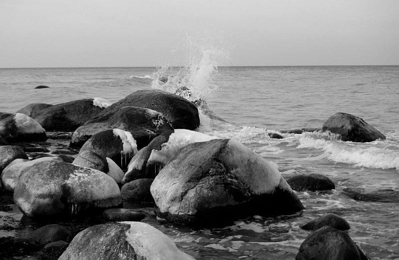 Der Strelasund und alle Boddengwässer sind bis auf die Fahrrinnen noch bzw. wieder komplett zugefroren, die offene Küste und die Buhnen dort mit dicken Eispanzern "österlich geschmückt", der Strand ist verharschter Schnee...