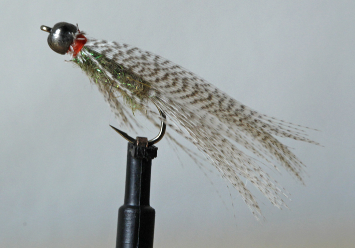 Gewässerabschnitten die Forellen anspringen. Das Ergebnis war unglaublich aber wahr. (Ein kleiner Streamer). Gebunden mit etwas Glitzermixdubbing, einer Tungstenperle als Kopf für das Gewicht und Federn.