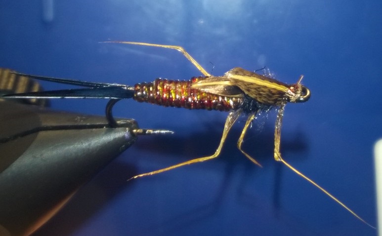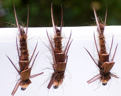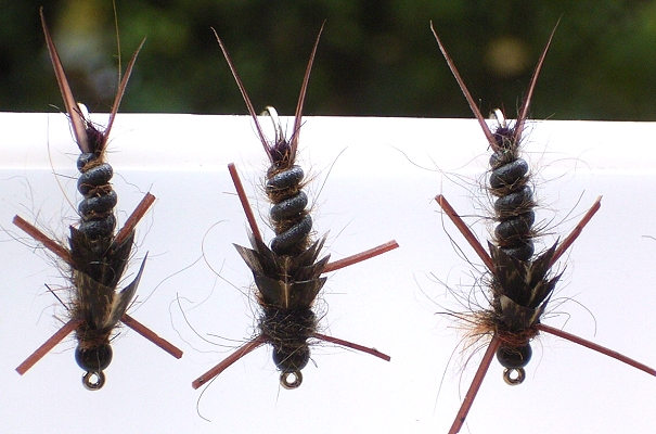 An meinen Gewässern gibt's keine (?) großen Steinfliegenlarven, aber ich wollte mal ein paar Tage an ein solches Gewässer und hab mir ein paar verschiedene Muster gepfriemelt ( leider war dann Hochwasser und es ging recht wenig)