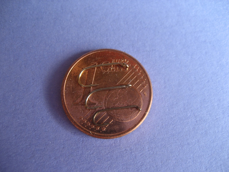 der in der Mitte soll ein #20er Haken sein? Der wirkt im Vergleich zur Größe der Münze eher wie ein #16er. Ich mache später mal ein Bild von dem was ich damit meine, muss mal schauen ob ich noch beide Haken zur Verfügung habe. Der obere scheint erscheint auch recht mächtig.