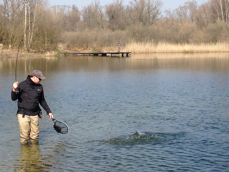 Ich trage sie links, seitlich an der Hüfte. An der linken Seite der Tasche habe ich den Watkescher befestigt (Keschermagnethalter inkl. Sicherungsleine quer um den Hals). Da ich mit rechts werfe, passt alles super.