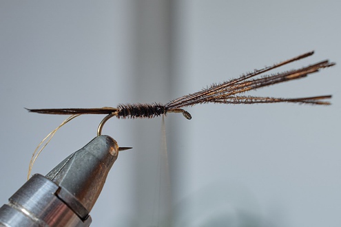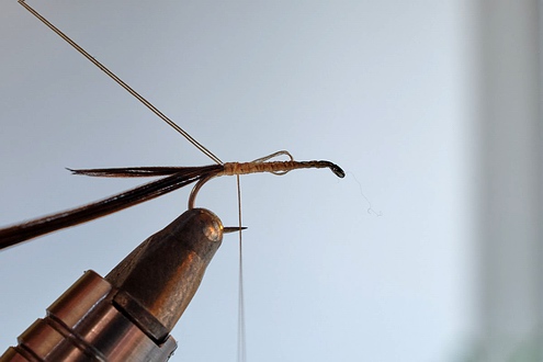 Etwa acht Fasanenfibern als Schwanz einbinden...