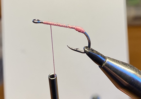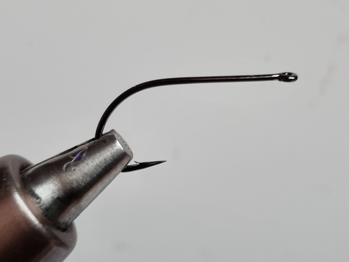 eingebunden. Da der vordere Bereich am Ende mit Kunstharz getränkt wird, ist eine Sicherung des Tinsels mittels einer gegenläufigen Rippung nicht notwendig... Ein Tropfen Sekundenkleber am Hakenschenkel schadet aber auch nicht! |