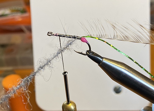 Ein Paar Shrimpaugen v-förmig vor der Dubbingkugel einbinden. Die Dubbingkugel lässt die Augen hochstehen. | Einen Strang Polarchenille einbinden. |