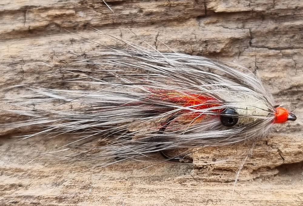 Die Vaskebjoern wird in der Regel auf Hakengröße 6 gefertigt. Eine sichere Bank im Frühjahr. Zum Herbst gern eine Nummer kleiner in Größe 8. Durch die Kugelaugen ist sie beschwert genug und somit auch gut an der Schwimmschnur zu fischen. Als Hechelmaterial verwende ich Whiting Speyhecheln. Material: