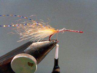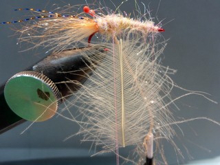 Haken: Partridge CS54 #6 Bindegarn: Veevus 6/0 pink Beißwerkzeuge: Swiss CDC XL thea, Baitfishdubbing salmon Fühler: Krystal Flash grizzly copper blue UV-Kleber: Solarez thin Dubbing: SLF Prism Dubbing tan, SLF Saltwater Dubbing tan und fluo salmon, gemischt Augen: Shrimp Eyes fluo orange „Hechel“: Polarchenille salmon und Swiss CDC XL thea Bindeanleitung: |