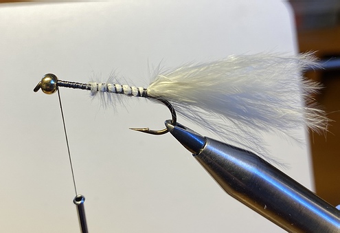 Als letzten Schritt die beiden weißen Gänsebiots auf dem Rücken platzieren und einbinden, ich lasse sie in der Regel etwas über den Ansatz des Schwänzchens hinausragen (siehe erstes Foto oben). Abschlussknoten setzen und mit Bindelack fixieren. |