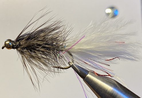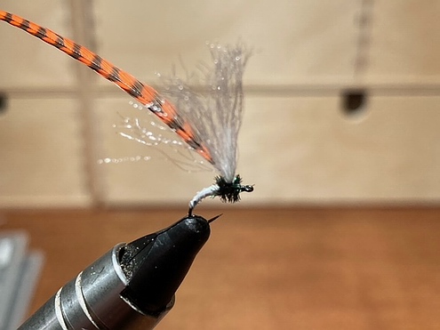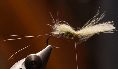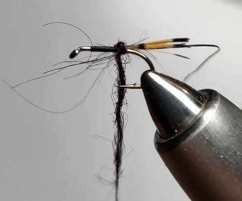 | (8) Überstehende CDC Federn abschneiden. | (9) Nochmals Dubbing vom argentinischen Hasen anbringen und die Fliege mit einem Köpfchen abschließen. |