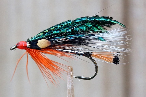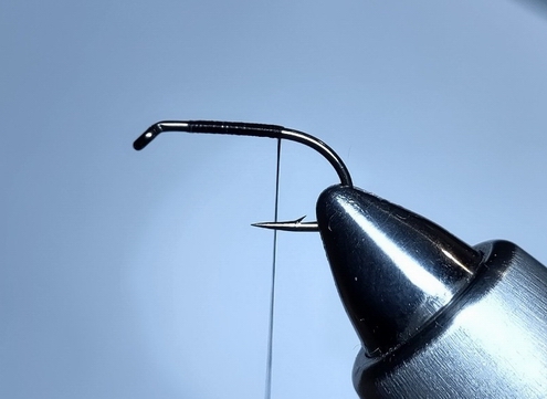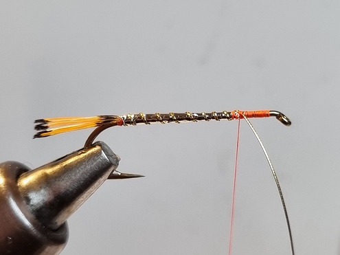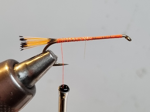 Den Rest des Federkiels nach vorn Richtung Öhr anwickeln. Bei Bedarf vorher so einkürzen, dass der Kiel nicht bis in das Öhr reicht. Nun binde ich die Pfauenfieber kurz hinter dem Öhr bis hinter den Post ein und führe den Faden wieder nach vorne. Die Pfauenfieber nun um den Hacken gewickelt nach vorne führen und einbinden und abschneiden. Mit dem WhipFinisher einen kleinen Kopfknoten bilden und den Faden abschneiden. |