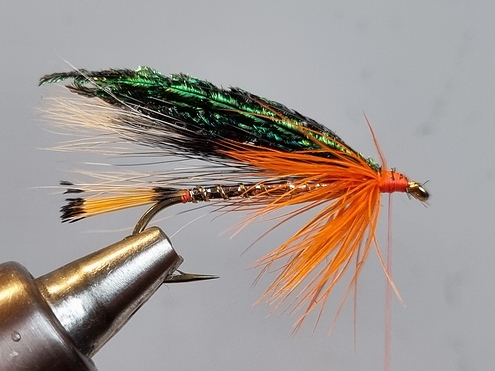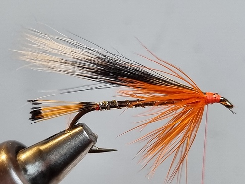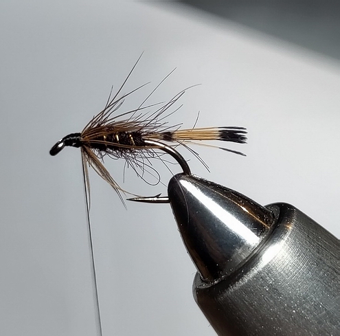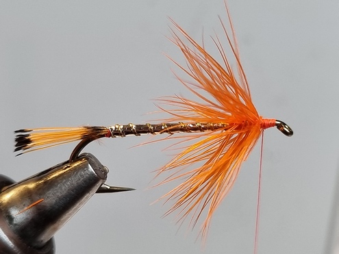 Haken: Standard Nassfliegenhaken (#8-14) (z.B. Kamasan B175 # 12) Bindefaden: Schwarz (Uni 0/8) Schwänzchen: GP Tippet Körper: Seehundersatz: z.B Angora Goat in weinrot Rippung: Rundes Tinsel in gold (small) Hechel: Hennensattel in ginger-brown Flügel: Stockentenerpel gesprenkelt Bindeanleitung: |
