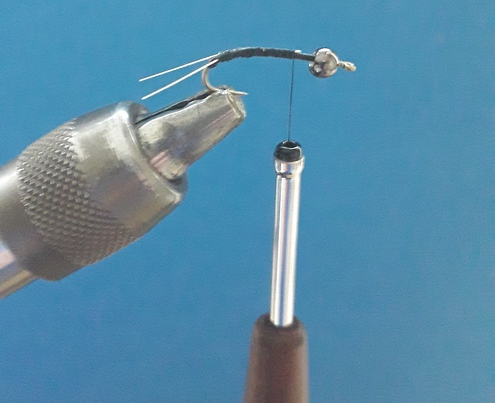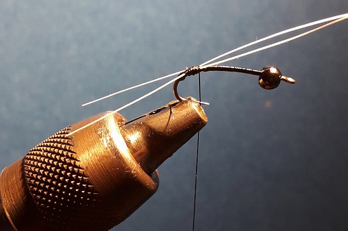 hinter der Kopfperle machen. Die Fibern nach hinten streifen und mit Bindegarn