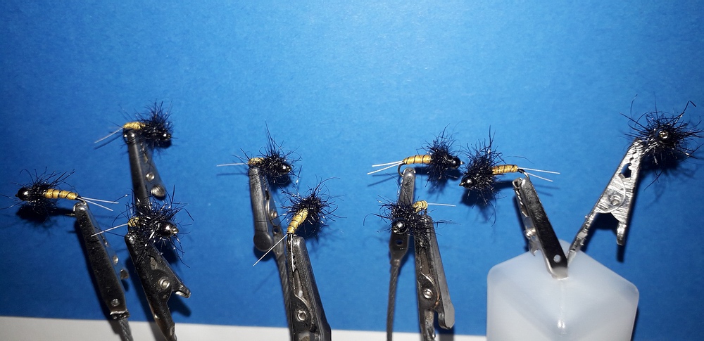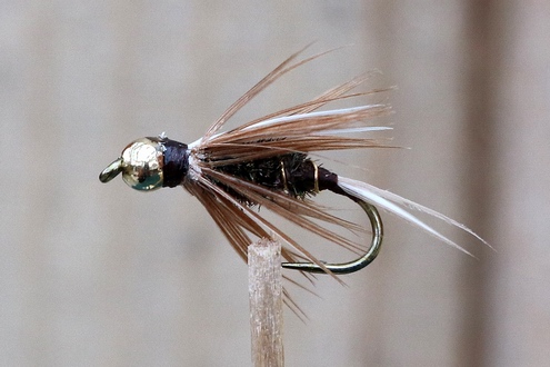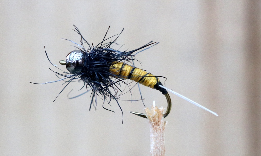 Die meisten unserer im Frühjahr gefangenen Rotgetupften fallen je nach Wasserstand auf die gelblich schillernden Nymphen, Hechelfliegen, No hackle Trockenfliegen oder Streamer herein. Meine erste Wahl im Frühjahr, insbesondere bei Saisonbeginn, ist die von mir gebundene Nymphe mit schwarzem Tungstenkopf. Wie gebunden imitiert die Nymphe meiner Meinung nach eine Larve der Eintagsfliege und im späten Frühjahr ggf. sogar eine Steinfliegenlarve. Kürzt man am Wasser die Schwanzspitzen ein und trimmt den Brustkranz wesentlich, fische ich die Nymphe als Köcherfliegenlarve. Material: