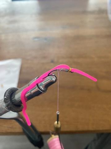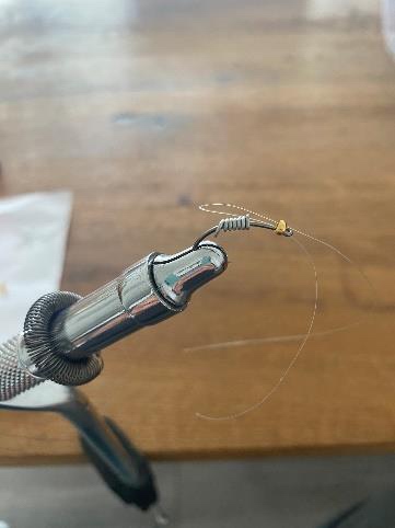 (8) Das Büschel entnehmen und auf den Haken oben auflegen, dabei festhalten und fest einbinden. Die Spitzen sollten etwa bis zu dem Schwanzende reichen. |