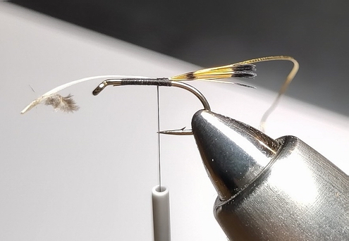 | (5) Eine Hennenhechel vorbereiten und mit der Spitze vorn einbinden. Darauf achten, dass genügend Platz nach vorn eingeplant wird. |