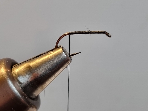 der Spitze in Richtung Öhr oben auf dem Haken einbinden. |
