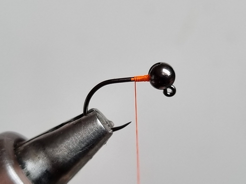 | 1. Haken einspannen, Grundwicklung legen. | 2. Mit dem orangen Fluo Floss Grundwicklung legen und Hinterteil formen. |