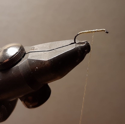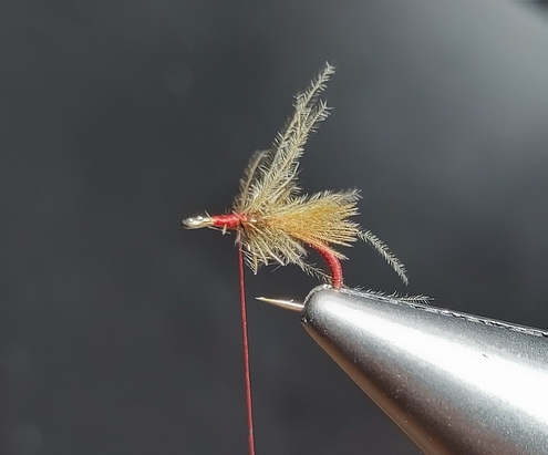 Ich nehme einen kurzschenkligen, Emerger bzw. Trocfliegenhaken, hier den TMC 2488 in #14, der Widerhaken wird angedrückt. Eine Grundwicklung mit einem gut spleissbaren, schwarzen Faden, hier ein Veevus in 8/0 bildet die Basis. In diesem Zuge binde ich einige Fibern einer braunen Hahnenhechel als Schwänzchen ein, dazu ein Stück feinen Kupferdraht als Rippung für den Körper. Der Faden wird gespleisst und etwas hellbraunes Glitzerdubbing damit versponnen. Den Dubbindstrang auf ca. 2/3 des Hakenschenkels wickeln und mit dem Kupferdraht rippen. Jetzt eine schöne CDC-Feder an der Spitze einbinden, in einem Bogen einbinden und vorne solange anziehen, bis die Größe des Loops passt, dann abbinden und den Federrest abschneiden. Anschließend einige Fibern einer 2. CDC-Feder in einer Klemme bevorraten, den Faden erneut spleissen und die CDC-Fibern mit dem Faden zu einer "Flaschenbürstenform" versponnen. Das ganze dann abwechseln hinter und vor den Loopwing um den Schenkel winden und an Ende der Fliege ein schönes Köpfchen verpassen. Nach Möglichkeit sollten alle Fibern aus dem Abschlussknoten raus bleiben, funktioniert leider nicht immer... Ein Tropfen Lack sichert das Ganze und die Bindearbeit ist erstmal fertig. Zum Schluss werden die Fibern auf der Unterseite der Fliege bündig gekürzt um eine korrekte Schwimmlage sicher zu stellen. Überlange Fibern werden ebenfalls passend eingekürzt, die Fliege ist fertig... Reinhard |