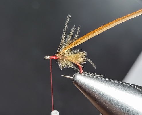 | (3) Die vom Flaum befreite, einseitig etwas „gerupfte“ Softhacklefeder unmittelbar hinter dem Öhr einbinden. | (4 ) Den hängenden Faden im oberen Bereich mit Wachs oder Kleber bestreichen und etwas feines Dubbing leicht „struppig“ als Thorax einbinden. |