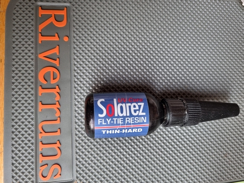 | 9. Solarez UV-Lack | 10. Den Körper der Nymphe komplett mit einer Schicht UV-Lack versehen und mit der UV-Lampe aushärten. |