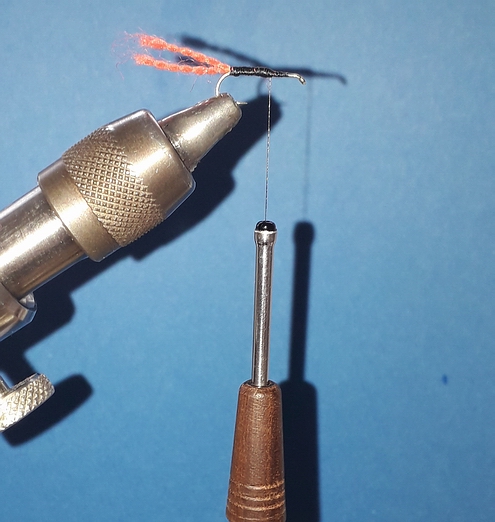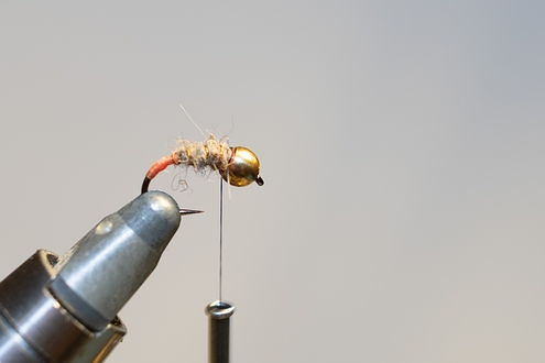 | Verwendete Bindematerialien | (1) Kopfperle auf den Haken schieben und Haken in Bindestock einspannen, ca. 2-3mm feinen Bleidraht hinter der Perle wickeln und in den Hohlraum der Kopfperle pressen |