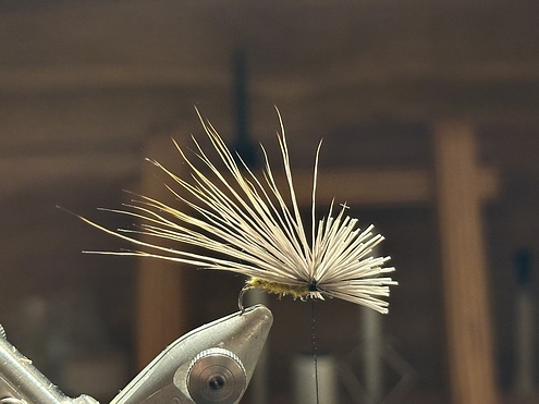 - Ahrex Dry Fly Gr. 14 - CDC Federn Gelb und Brown - Semperfli Garn 100dn - Rehhaar Bindeschritte: |