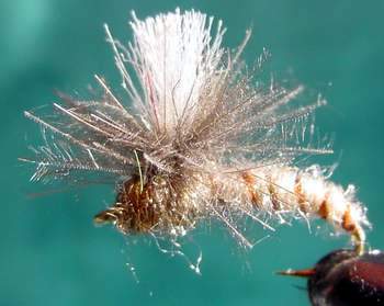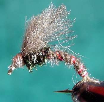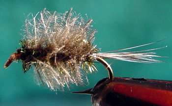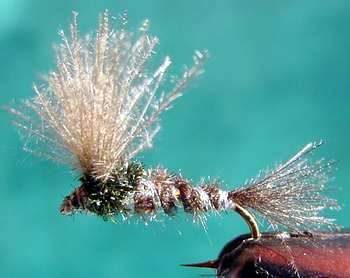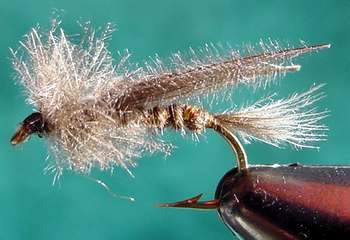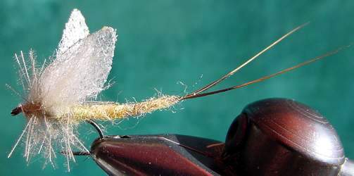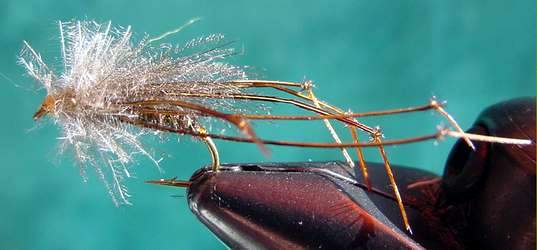 Haken: Trockenfliegenhaken Schwanz: CDC-Fibern Hinterleib: ganze CDC-Feder gedreht, Rippung "Lureflash" Abdomen: Pfaugras Flügel: Büschel von CDC-Fibern, ohne Hechelstiele Das Büschel CDC-Fibern wird zuerst eingebunden, dann Schwanz und Hinterleib gebunden. Die CDC-Fibern wird beim Winden des Thorax durch kreuzweises Winden des Pfaugrasses geteilt. |