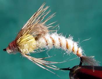 Haken: Aufsteigerhaken Hinterleib: Antron ( Schlingentechnik), Rippung "Lureflash" Abdomen: Antron, dunkler als der Hinterleib Flügelknospe helle Kunstfasern, als Bunchflügel eingebunden. Hechel: CDC-Fibern (Schlingentechnik) um den Flügel gewunden. Bei dem Hechelkranz sollte der Hechelfaden immer unter der vorherigen Windung liegen. Den Bunchflügel beim Einbinden recht lang lassen und erst auf die gewünschte Länge stutzen, wenn der Hechelfaden gewunden und festgelegt ist. |