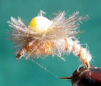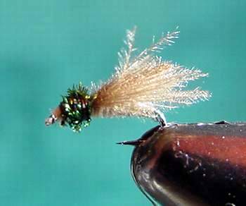 Haken: Trockenfliegenhaken Hinterleib: Bindeseide, Rippung "Lureflash" Abdomen: Pfaugras Flügel: Spitze einer CDC.Feder Der Pfaugrasabdomen wird vor den CDC-Flügel gewickelt. |