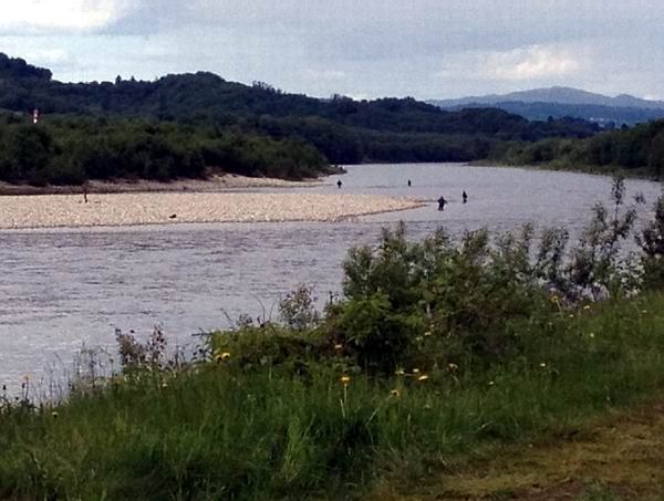 Ach du heiliges Kanonenrohr! Wie hat er denn das geschafft? Wildes, steiles, mit großen Steinen befestigtes , eigentlich unbegehbares Ufer. Aber ein Lachs verleiht Flügel! Er erzählte mir später: Der Fisch nahm in der Mitte, direkt im Auslauf, er war nicht zu stoppen, zog ihn die ganze Strecke runter. Leistungssport