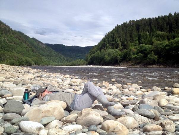 | Am Lundamo Pool erlebte ich die erste Überraschung: Da standen auf der Kiesbankspitze drei Wurmangler – festgemauert! Ich schaute genauer hin! Die Bank hat sich im Winter auf das BL Gebiet verschoben, der von mir geplante Angelplatz war weg! Dann kam die zweite Überraschung: Keine Fische!! Die Schneeschmelze verlief in diesem Jahr sowieso ungewöhnlich, während wir in Deutschland im Dauerregen ersoffen, hatte man über den ganzen Mai hier Sonnenschein und über 20°C. Der Fossen war offen, oben konnte gefischt werden. Ich startete oben in Singsas, kaum zu glauben, ich bekam eine Kanone an die Angel, die drehte sich im relativ hohen Wasser um und tobte die Rausche runter. | ![]() |