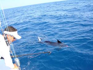 Langsam, sehr langsam gelang es mir, den Fisch an das Boot zu bringen. Endlich konnten beide mates mit einem speziellen schonenden Gaff den Fisch heranholen und den Haken entfernen. | ![]() |