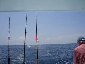 "Caast, caaast!!" Die befehlsgewohnte Stimme von oben überschlug sich fast. Natürlich gehorchte ich sofort und warf die weiß- und pinkfarbige Tubenfliege in Richtung des dritten Teasers, den der eine "mate" gerade mit hoher Geschwindigkeit herankurbelte. Wusste ich doch, dass der "Herr über mir" auf der flying bridge die bessere Sicht auf den Fisch hatte. Das Boot verlor gleichzeitig an Geschwindigkeit, da es der captain "out of gear" nahm. So wird hier das Auskuppeln genannt. Das Boot fährt dann noch ohne Antrieb weiter. Der mate holte genau im dem Moment mit Schwung den Teaser aus dem Wasser, als meine Fliege seitlich des Fisches in das immer noch schaumige Wasser fiel. |