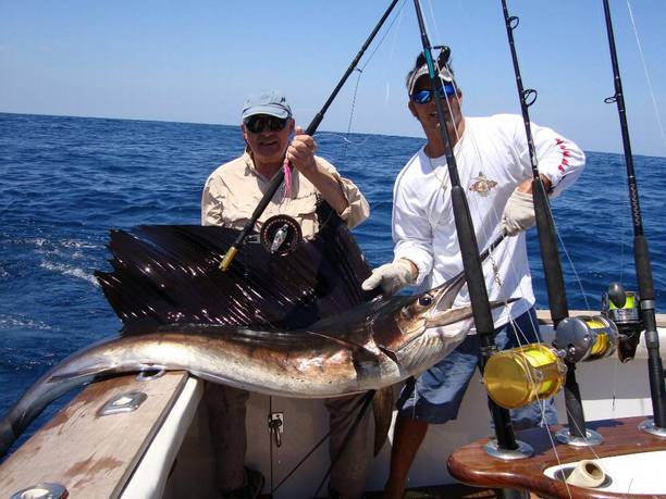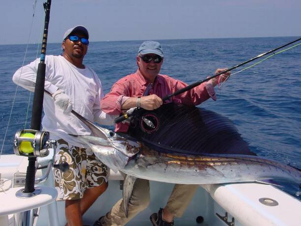 Wenn der Captain nicht sofort Gas gegeben hätte, wäre der Fisch und möglicherweise auch die gesamte Fliegenschnur verloren gewesen. Überhaupt muss deutlich gesagt werden, dass der Erfolg dieser Art des Salzwasserfischens zum großen Teil von der erfahrenen Bootsbesatzung abhängt. Der Angler fängt zwar den Fisch, aber nur wenn er optimal unterstützt wird. Ich konnte an diesem ersten Tag also noch nacheinander drei schöne Sail-Fische fangen. |