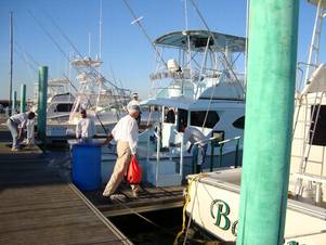 Auf der ersten Fahrt übergab der captain einem seiner zwei mates das Steuer und examinierte aufmerksam mein Gerät. Die Rute, eine "Cam Sigler" für Schnurklasse 14 wurde abgenickt. Das ist hier der Standard. Meine Rolle, eine Ulti Mode #4 mit Power & Speed- Hebel, wurde aufmerksam betrachtet. Das kannte er noch nicht. Konnte er auch nicht, da diese Rolle noch ein Prototyp war. Diese Rolle interessierte ihn so stark, dass er seine Kamera holte und sie wiederholt fotografierte. |