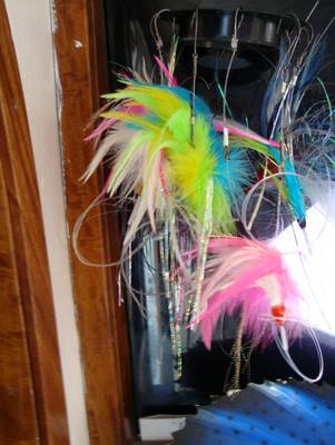 Dazu werden Köderfische (Balao oder Ballyhoo) regelrecht mit einem bestimmten Zick-Zackmuster mit einem dicken Floss vernäht und mit einer Bleikugel am Kopf verbunden. Das ist der Teaser, der letztendlich den Fisch zum Angler lockt. Zwei weitere Teaser mit Plastic-Tintenfischen werden an langen Outriggern in genau festgelegten Entfernungen zum Boot geschleppt. |