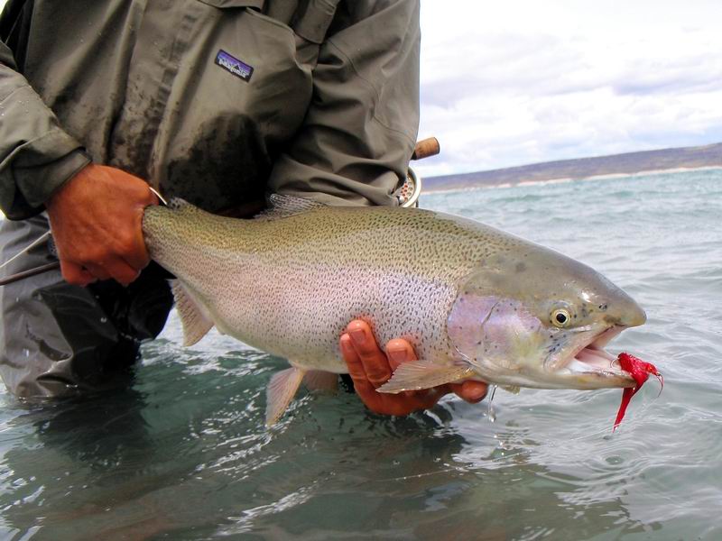 Der prominenteste See, der fälschlicherweise in diese Rubrik eingeordnet wird, ist der Lago Strobel, gelegen in der Meseta auf nahezu 900 Meter Meereshöhe und mit einer der größeren seiner Art. Dieser See wurde niemals mit Salmoniden besetzt! Die Lagunen in nächster Nähe des Strobel wurden als natürliche Zuchtteiche benutzt, diese unterteilt mit Fischen in verschiedensten Entwicklungsstadien, um eine ganzjährige „Produktion“ sicherzustellen. Das patagonische Klima ist launisch und unvorhersehbar und so, nach einem äußerst schneereichen Winter und einen durch die Schneeschmelze des Frühjahres angeschwollenen Baches, wurde der gesamte wertvolle Inhalt dieser Zuchtteiche in den Strobelsee geschwemmt. Die aus dieser unglücklichen (?) Einbringung bestehende Fracht aus Alevinen und mehrsömmrigen Forellen fand hier paradiesische Futtergründe, die beinahe ausschließlich aus Anfipoden besteht und noch dazu eine natürliche Reproduktionsquelle: den Rio Barancoso. Das Heranwachsen diese wahrhaften Ausnahmefische ist einzig und alleine durch das immense Futterangebot und das Fehlen jeglicher Nahrungskonkurrenten zu begründen und steht in keinem Zusammenhang mit unfundierten geothermalen Aktivitäten in dieser Region, welche die Wassertemperatur des Sees beeinflussen! |