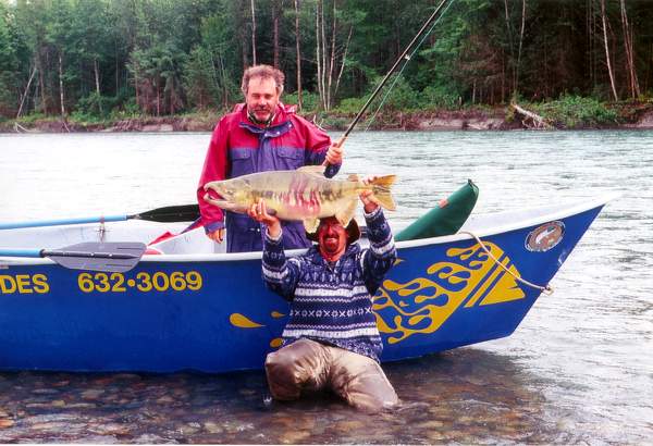 Der Hundslachs wog 32 Pfund und wurde von mir im August 2001 in Kanada mit der Fliege gefangen. Nach dem Foto durfte er wieder schwimmen. Er ist sicher einer der größten Hundslachse dieser Erde. Foto und Copyright: