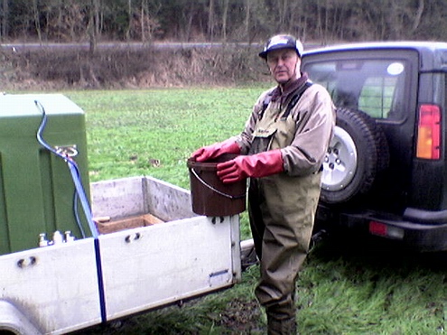 am Rechen vor der Wasserkraftanlage, die kleineren werden hindurch schwimmen.