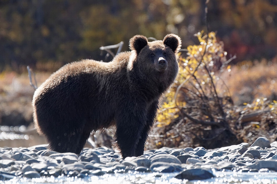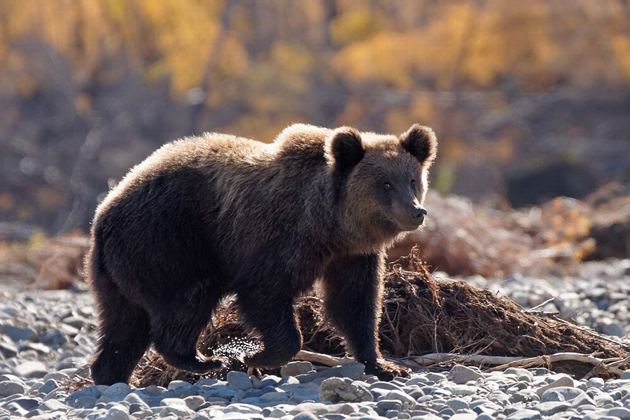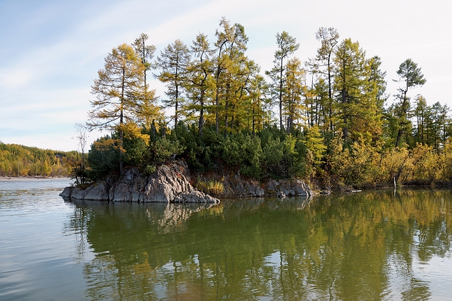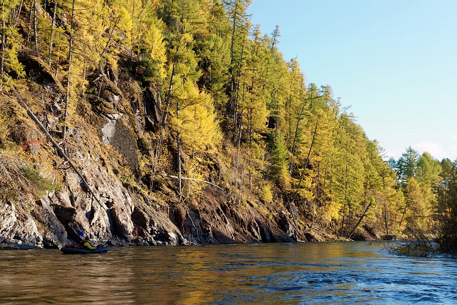 | Als Lohn erwartet uns an der Ketanda eine Traumlandschaft. Der Fluss ist hier etwa so groß wie der Unterlauf der Ybbs oder Steyr und führt mit einem pendelnd-verzweigten Lauf durch die Taiga. Am Ufer stehen fast kitschig goldgelb verfärbte Lärchen. Es fällt sofort die reiche Tierwelt auf, wir beobachten Riesenseeadler, Möwen, Fischadler und Braunbären. An der Judoma war es noch fast gespenstisch ruhig, in der spätherbstlichen Taiga sahen wir dort kaum Vögel oder Tierspuren. Der Grund für das reiche Leben auf der anderen Seite der Wasserscheide ist schnell gefunden – ein später Aufstieg an Silberlachsen bietet auch den Tieren des Landes und der Lüfte eine schier unerschöpfliche Nahrungsressource. |