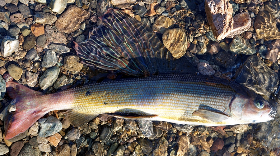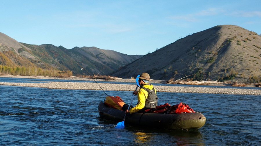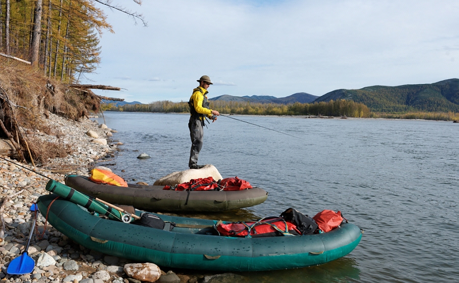 | Eine Hauptattraktion in diesem Fluss bietet eine besonders schöne Form der Ostsibirischen Äsche (Thymallus arcticus) pallasii). Sie zeichnet sich durch eine sehr große Rückenflosse mit einem auffälligen, zu langen Streifen verbundenen Farbmuster aus. Auch ein rötlich gefärbter Schwanzstiel ist charakteristisch. Leider fehlt die Zeit fürs Trockenfliegenfischen während der nachmittäglichen Steigphasen der zahlreichen Äschen. Die temperamentvollen Fische nehmen aber auch größere Streamer und Jigs, die wir zum Fang der Lachse und Saiblinge einsetzen. | ![]() |