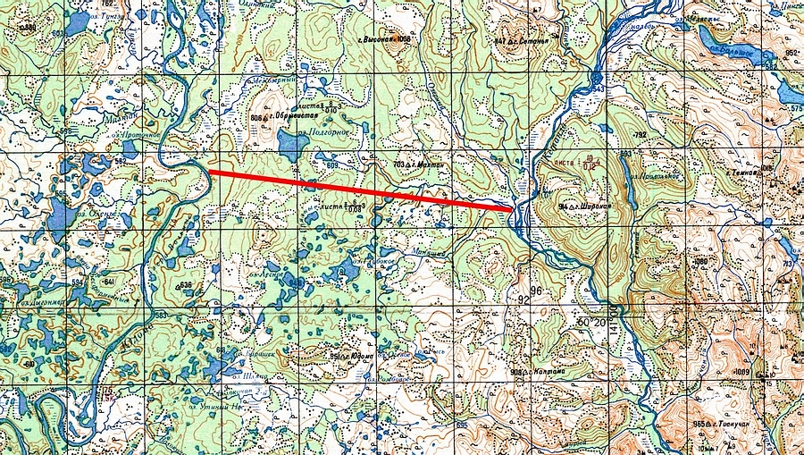 Luftlinie vom Fluss Ketanda im Einzugsgebiet des Ochotskischen Meeres.