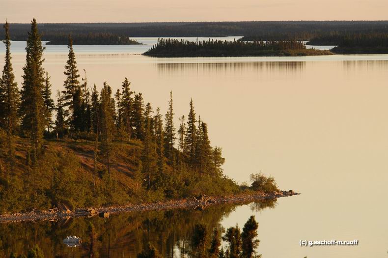 Der gigantische Kasba-Lake ist Namensgeber für die einzige Lodge an diesem „Inland-Ozean“. 3-fache Bodenseegröße (!), hunderte Inseln, flache Buchten, riesige Krautbeete, Kanten, große Tiefen: Kasba-Lake ist ein Fisch- und Anglerdorado und die Kasba-Lodge mittendrin. Meist sind nur kurze Anfahrtswege notwendig, um erfolgreich auf große Hechte und die Hauptattraktion, die großen „Lake trout“ (= Namaycush Saiblinge) zu fischen. Diese bildhübschen braun-oliven Räuber sind in großer Zahl in fliegenfischerfreundlichen Stückgewichten von 4-10Pfund vorhanden. Der Rekord auf Fliege liegt bei über 30 Pfund! Beste Fangchancen hat man bei schönem Wetter. Schönes Wetter an der Baumgrenze der North West Territories? Klar gibt’s das, aber natürlich nicht immer... Bären haben hier keine Sorgen => Unten: Unser