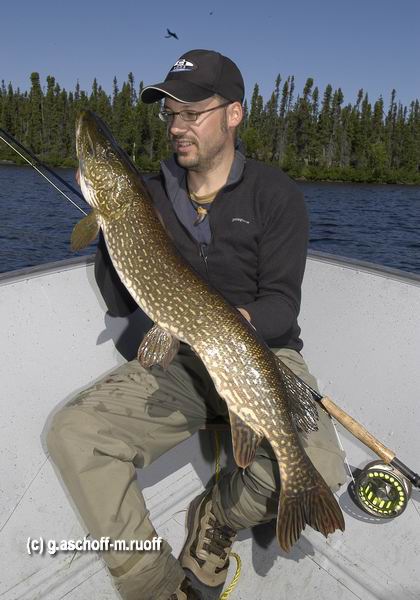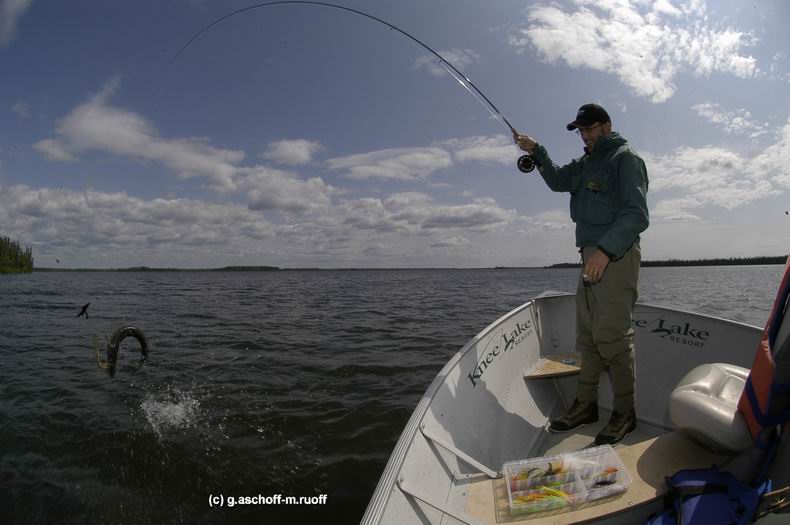 Das Boot droht über den Fisch zu treiben. Es bleibt nur eine Möglichkeit. Aber schnell! Zurück mit dem rot-schwarzen Federvieh ins Wasser. Kein Wurf, ein Ablassen. Marabou pulsiert, Tinsel glitzert. Auge in Auge. Und dann schnappt er zu. Einfach so. Blitzartig, archaisch, aggressiv. Wie ein Wolf mit riesigem Rachen. Der Anschlag wie in Trance. Das Erwachen so brutal und hart wie der Drill. Dann liegt er vor mir, der Traum jedes mitteleuropäischen Fliegenfischers: ein Meterhecht! Für einen kurzen Moment steht die Zeit still. Alles ist in Einklang: unberührte Natur, Mensch, Tier. Das reine Zen. Wie so oft in den letzten Tagen... Wir erleben dieses Privileg in zwei der besten und bekanntesten Lodges Zentralkanadas, Northstar-Resort und Kasba-Lake-Lodge. Kneelake