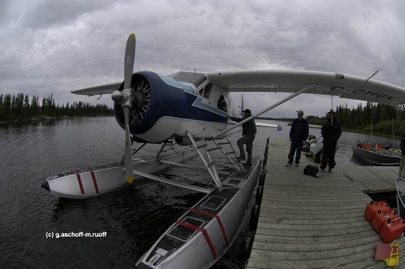 Der größte Brocken quert allerdings bei der abendlichen Rückfahrt vor unserem Boot: ein ausgewachsener Schwarzbär auf Schwimmtour! Die nächsten beiden Tage sind für Fly-outs, also „Aus-Flüge“ reserviert. Phil Reid, Besitzer des Northstar-Resort, hat mehrere Spitzengewässer im Programm, die gegen Aufpreis mit dem Wasserflugzeug angeflogen werden. Zwei davon, für Fliegenfischer besonders interessant, sind der traditionsreiche Hayes-River und der See der Hechtriesen, Semmens-Lake. Semmens