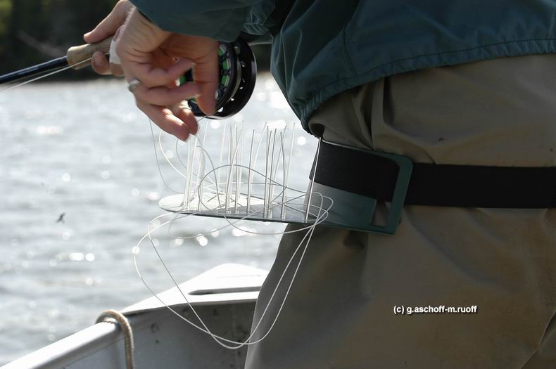 Gerät/Ausrüstung Ruten und Schnüre: Hecht: Eine kräftige 9er Rute kombiniert mit einer 9er oder 10er Schnur ist wegen des Windes und für die großen Fliegen ideal. Auch das schnelle und schonende Ermüden der Fische ist mit dieser Kombination sichergestellt. Schnüre: eine sinkende Clear Tip mit schwimmender Runningline, eine WF-Schwimmschnur und eine 350er Teeny Sink-Tip-Schnur für tiefe Rinnen und Kanten. Als Vorfach ist 30lbs Hard Mason oder 30lbs Stahlvorfach (knotbar) ideal. „Lake-trout“: Kräftige 7er oder 8er Rute. Eine passende WF-Schwimmschnur und eine leichtere Teeny Sink-Tip-Schnur (z.B. 250er) decken alle Einsatzbereiche ab. Äsche: das auch in Mitteleuropa bewährte 5/6er Gerät mit Schwimmschnur und austauschbaren Vorfächern verschiedener Sinkraten ist auch für arktische Äschen perfekt geeignet. Schnurkorb: Ein absolut unverzichtbare Utensil für das Fliegenfischen vom Boot aus. Eine Neuheit ist der Flexi-Stripper Bjarne Fries aus Dänemark. Der Flexi-Stripper funktioniert wie ein Schnurkorb, ist aber wesentlich kleiner, leichter zu transportieren und sehr robust. Für die Bootsfischerei ist der Flexi-Stripper bzw. ein Schnurkorb wg. der ständigen Verhedderungsgefahr unverzichtbar. Ich verwende ihn inzwischen zu 90% meiner Fischerei, selbst beim normalen Fischen an Fließgewässern. Eine ausgezeichnete Investition. |