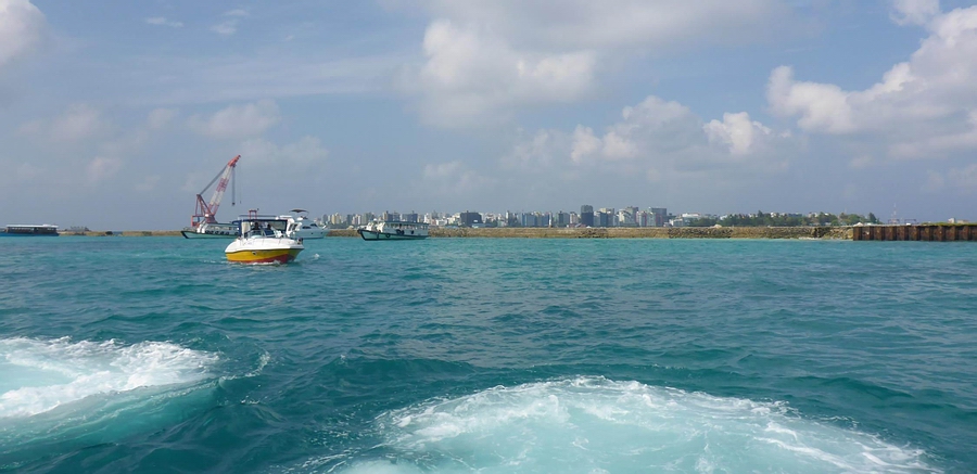 Ankunft auf dem Transferboot mit Blick zurück auf die Hauptstadt der